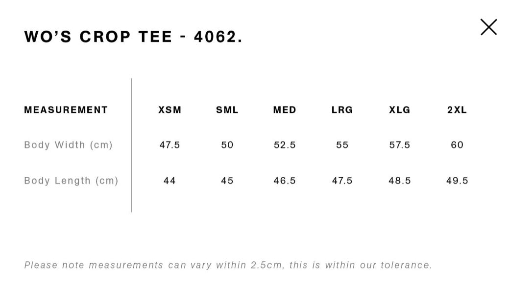Short body, dropped shoulders, neck ribbing, side seamed, shoulder to shoulder tape, double needle hems, preshrunk to minimise shrinkage